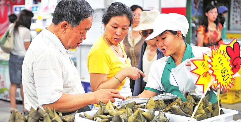 对于端午节来说,粽子等一些食物早已是节日的“必备”。记者在市区各大超市发现,各种品牌的粽子已经摆在了最显眼的位置,甚至自成“一片天地”;一些蛋糕房也积极“作为”,特色粽子也摆在了货架上;连菜市场的小摊小贩们也自制散装粽子,不同口味、大小,打出“物美价廉”牌参与竞争。
